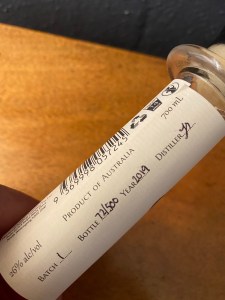 - Neat: A very mild hint of spirit up front with a bone dry finish leaving a lingering taste of a subtle mix of white pepper, lemon citrus, and what I take for as the lime mint hint of Boobialla at the back of the palette. Quite light overall on the palette, austere but crisp and restrained.